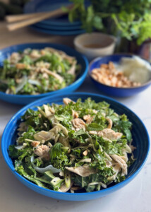 The Kale Salad in these photos is made with "curly" kale, which is a lighter, brighter green with the ruffled edges, makes the salad a brighter, slightly more vibrant green.